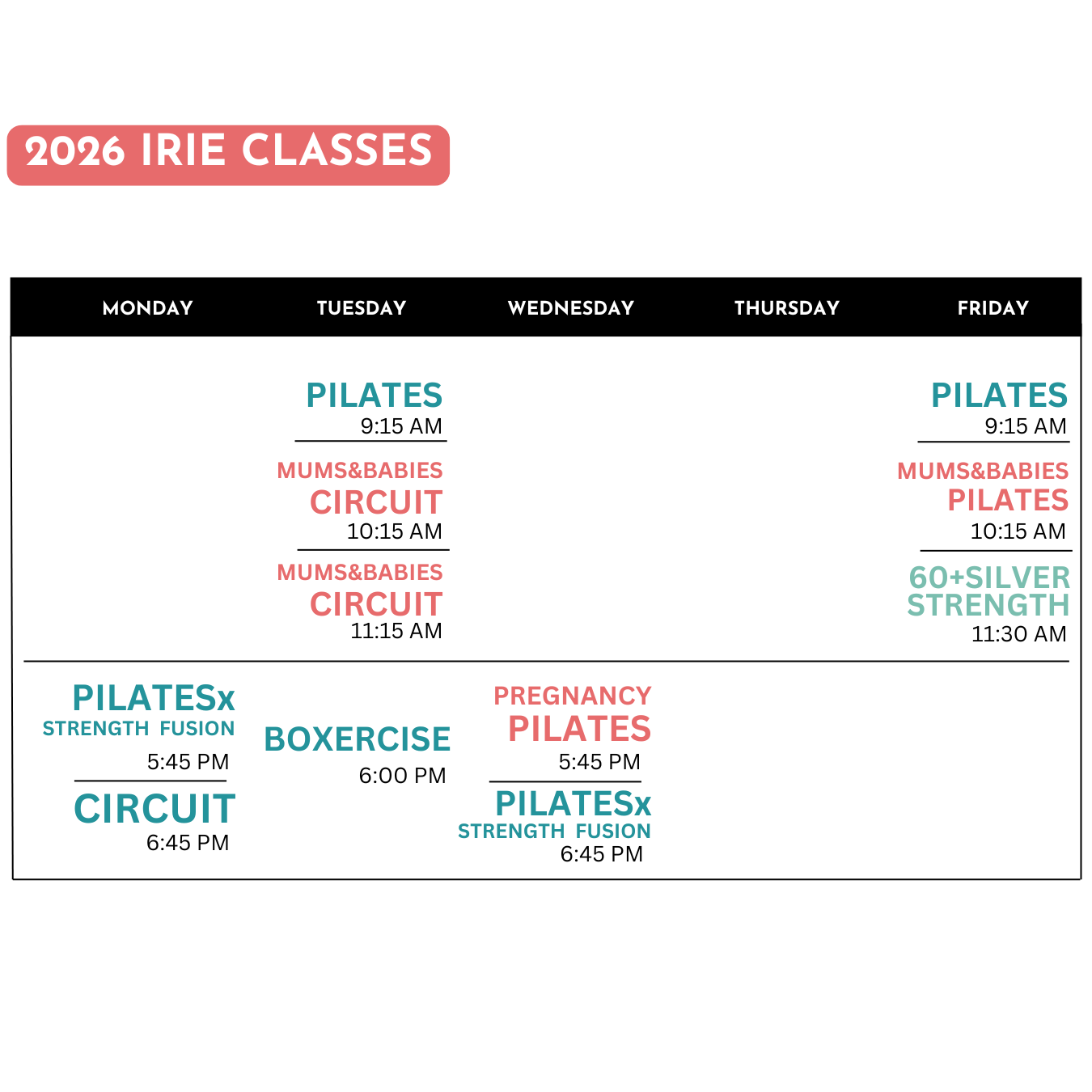 At our brand-new place, IRIE - The Joyful Movement Studio, located in Hebron Industrial Estate, Kilkenny, we offer a diverse range of group exercise classes tailored to women of all ages and fitness levels. From invigorating Ante- and Postnatal programmes and Pilates sessions to our joyful Boxercise, IRIE Women-only Circuit Training classes, and Strength Training programmes catered to adults over 60, there's something for everyone seeking to enhance their health and vitality.